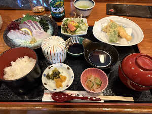 宗像大社帰りに立ち寄り。玄海の刺身に天ぷらと堪能しました