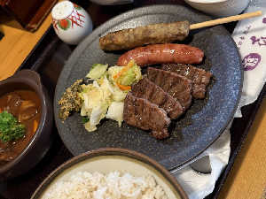仙台限定スペシャルメニューは厚焼or牛タン焼きにシチュー、つくね、ソーセージ。麦飯は大盛り無料。