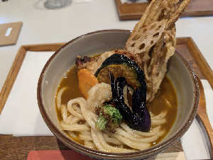 具沢山のカレーうどん。スープのとろみと、つるつるシコシコした麺が美味しい。しょっぱくないので完飲😁