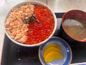 鮭の切り身、ほぐし、いくらの乗った 3色丼。中落ちみたいなのも入ってて おいしかった!