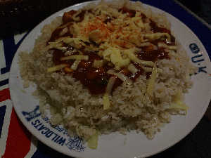 ごはんは全部ガーリック 肉は赤身(ちょっと甘めな味付け) アメリカンな店内とメニュー表が癖強