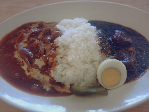 ザイカレー(左側)はピリッと辛め。ビーフストロガノフ(右側)は甘め。ご飯はやや堅めでした😋