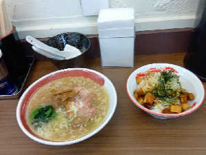 今回は塩ラーメン&コロチャーをチョイス うまいっ! 前回同様、接客&回転率&駐車場整理が見事でした
