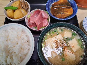 かつ煮、なす味噌、漬け物、豚汁中 お刺身が美味しそうだったから次回忘れないようにする!