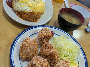 ピーマン、ハム、の家庭的なオムライス✨豚汁もボリュームたっぷり。とり唐揚げも大きくてザクザク
