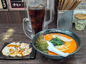 今日はこちらでサ飯(夕飯)は辛いラーメンで汗活を❗️ ゴハンは無料だったが食べ残しは罰金100円