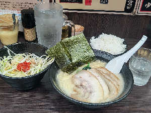 チャーシュー3枚、味玉、のり5枚のラーメン。ライスは無料。 サウナ後の塩分補給にぴったりの味でした。