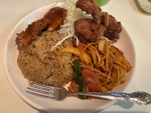 ボリュームたっぷり うまい ドライカレー、チキンカツ、からあげ2個、ナポリタン、千切りキャベツ