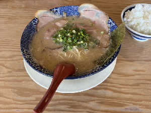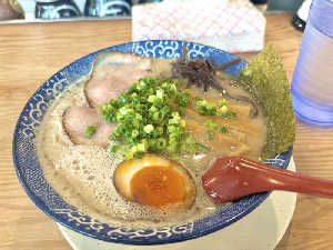 クリーミーな豚骨スープ、キクラゲ多めで、煮卵も良い塩梅。卓上の高菜、すりごま等もいっぱい入れて旨旨。