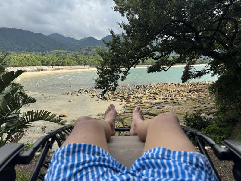 暑すぎて使わないでしょと思ってたけど、水風呂上がりの身体には最適。ととのい椅子で海を見ながらのんびり。