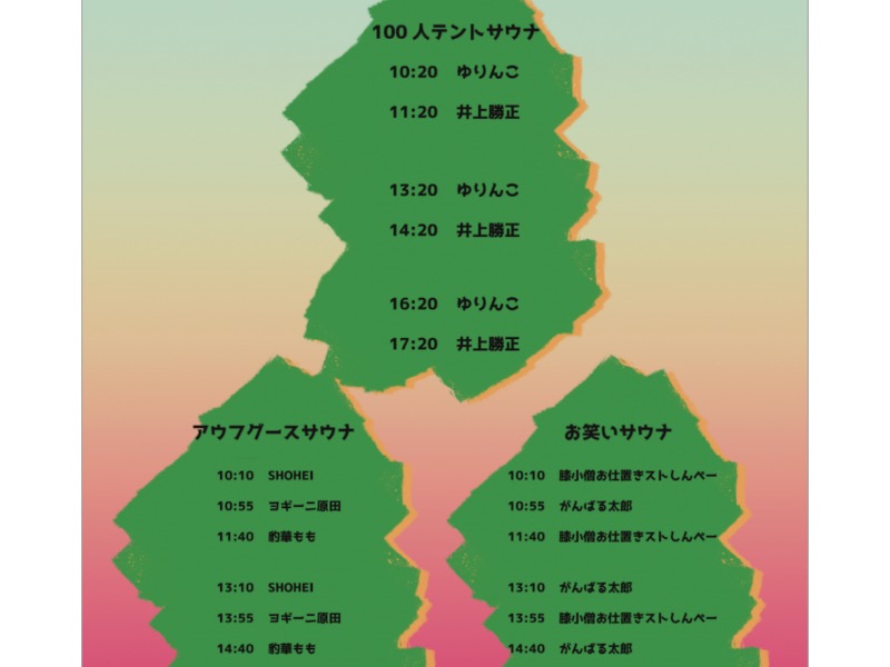 井上勝正さんの熱波は初めて受けましたが、始まる前の口上から惹きつけられるものがあり、言葉の一つひとつが胸に沁みました。前半はみんなでカウントしながら全員に熱波を送ってくれてすぐに滝汗🥵クールダウンでは井上さん自ら参加者に頭から水をかけてくれて早くも天国行き、テントに戻り後半も熱すぎずでもちゃんと汗をかかせるこれが黄金体験でしょうか!全ての雑念が消える瞬間でした!パネッパ!
