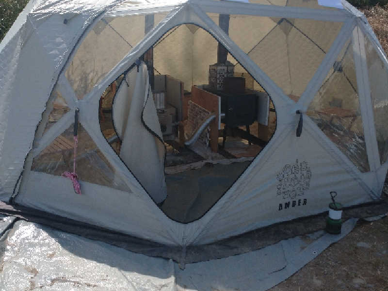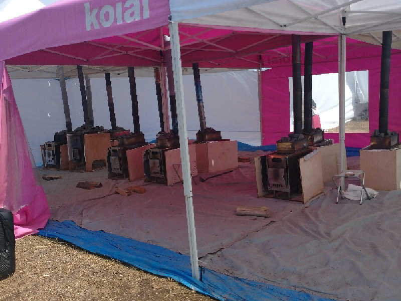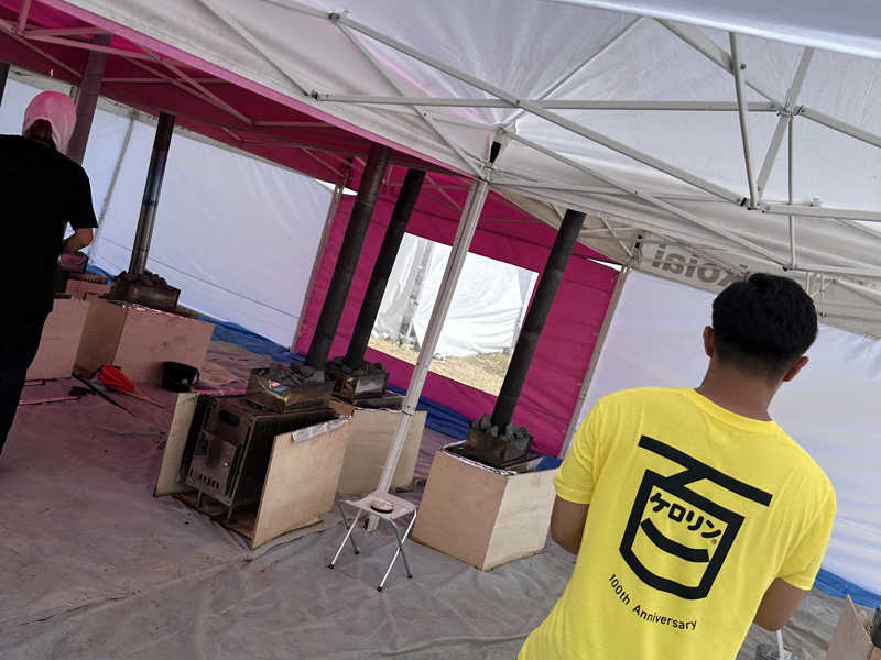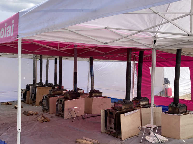肝心のこのテントサウナですが、大きなテント6つを連結した構造で、中にストーブが8機ぐらい配置されていて入っただけで「うっ」と来る高温セッティングでした😱