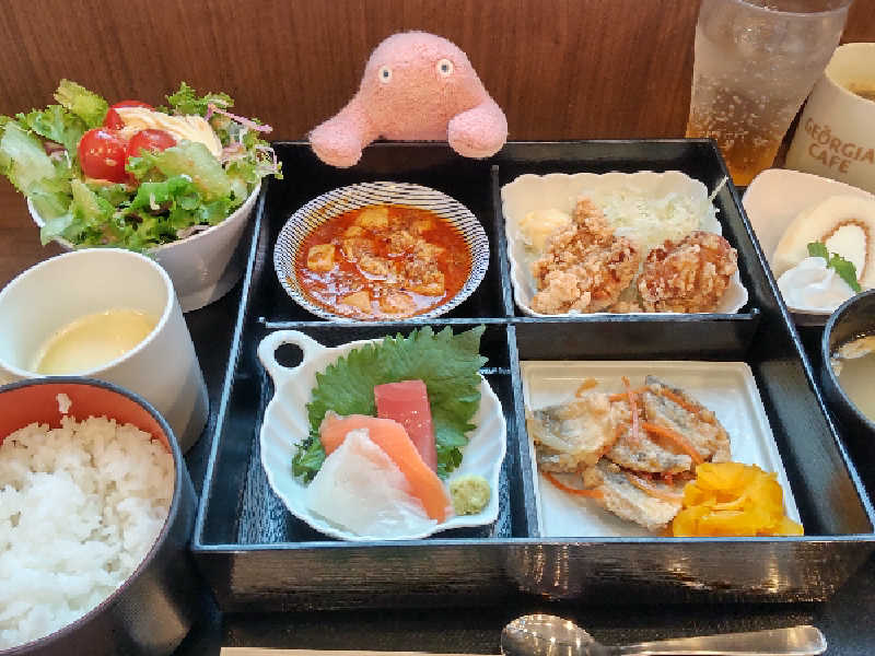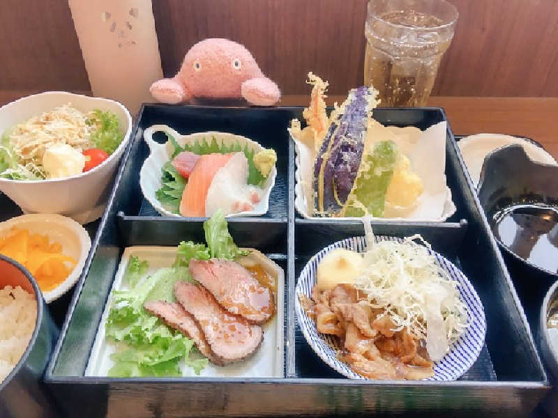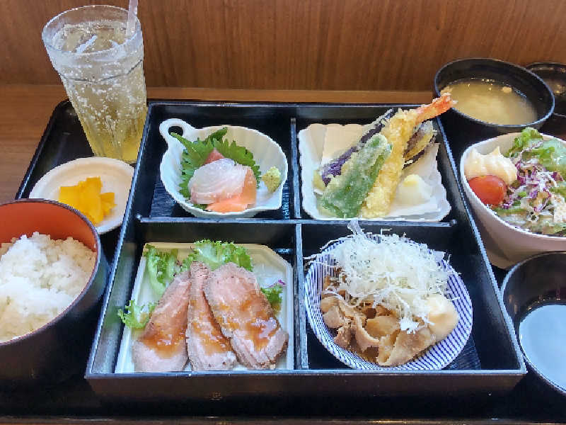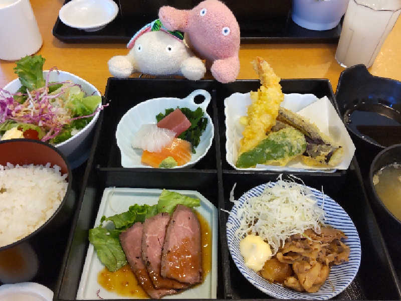 平日ランチは湯舞音御膳。おかず4品にサラダバー、デザートが付いてオトクです🎵