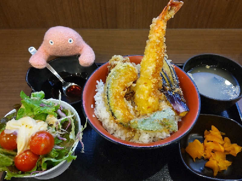 食事にはサラダと漬物サービス✨ フリードリンクの冷たいほうじ茶が嬉しい👍