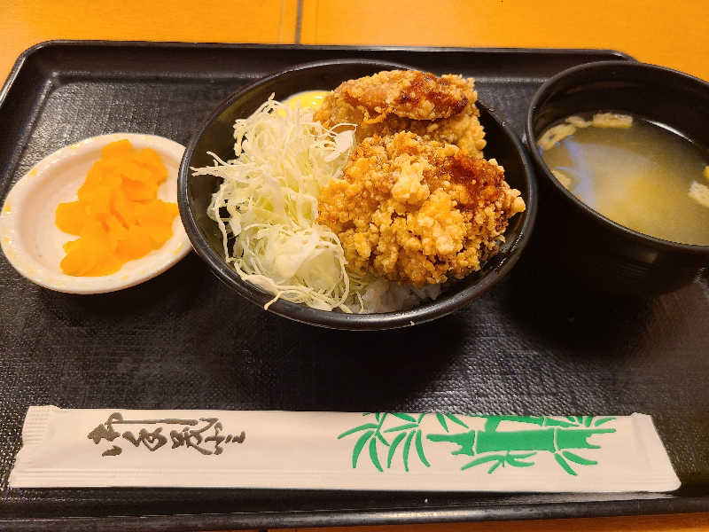 お新香・味噌汁付 小丼だけど 大きな唐揚げふたつ! キャベツもたっぷり!!