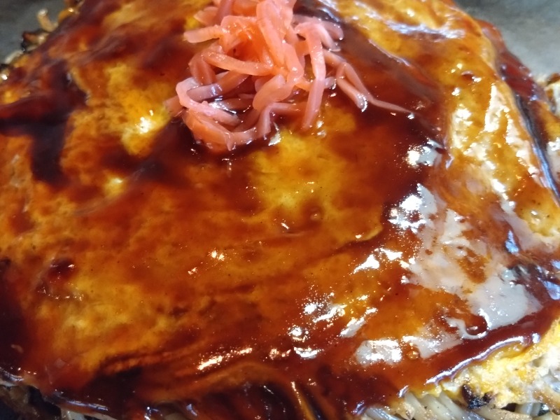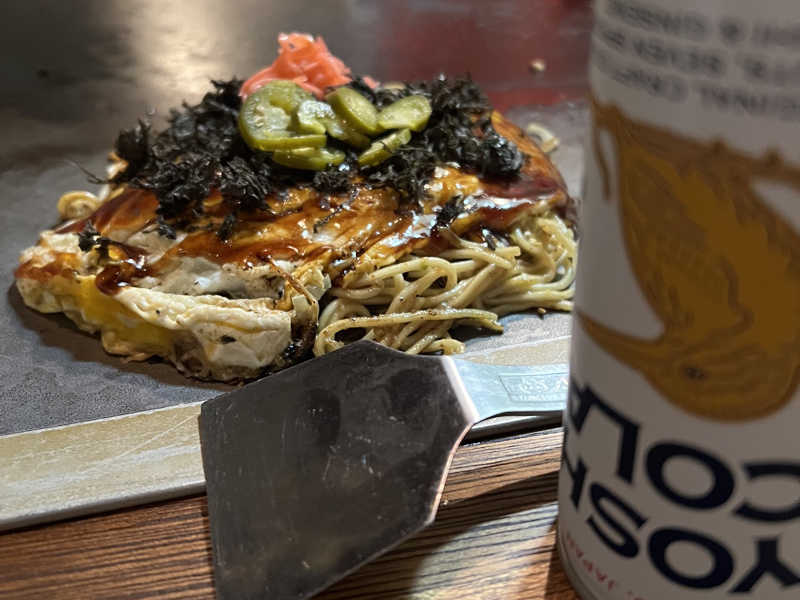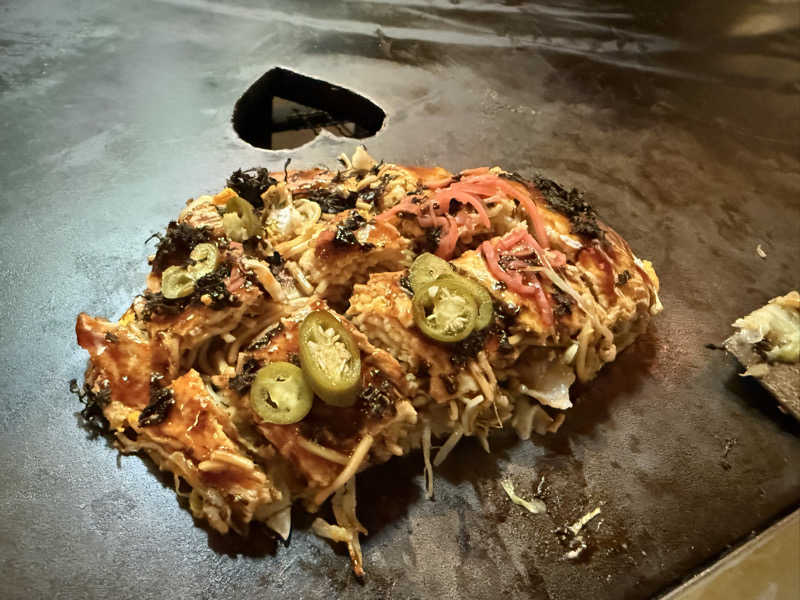 ハラペーニョのピクルスと海苔をトッピング。焼いてくれるヘラの音も最高。