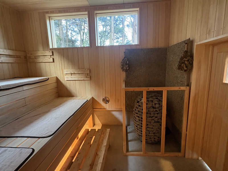 まずは電気ストーブのサウナ室。窓から光が差し込む明るいサウナ。