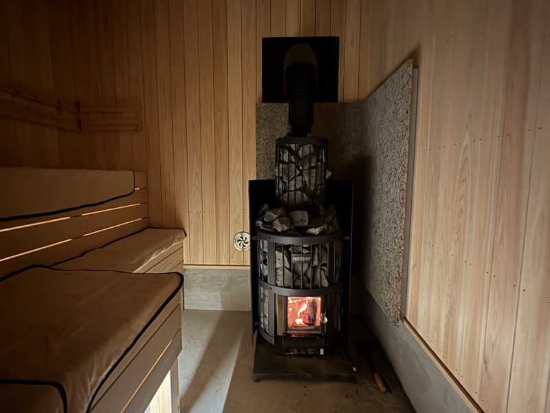 2つ目のサウナは薪ストーブ。窓は無く、薄暗い静かな空間。パチパチと薪の爆ぜる音のみが響く。。