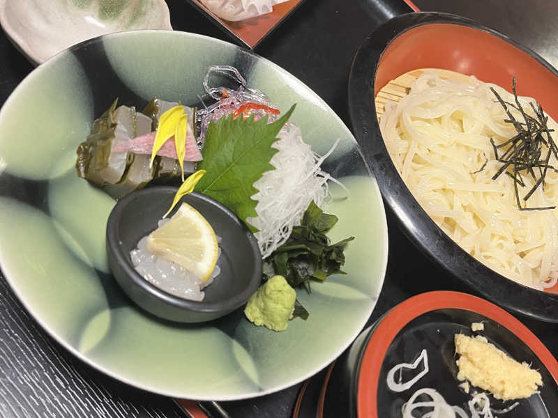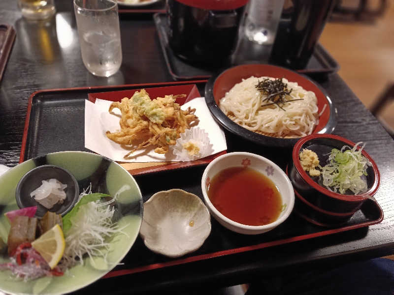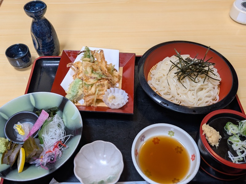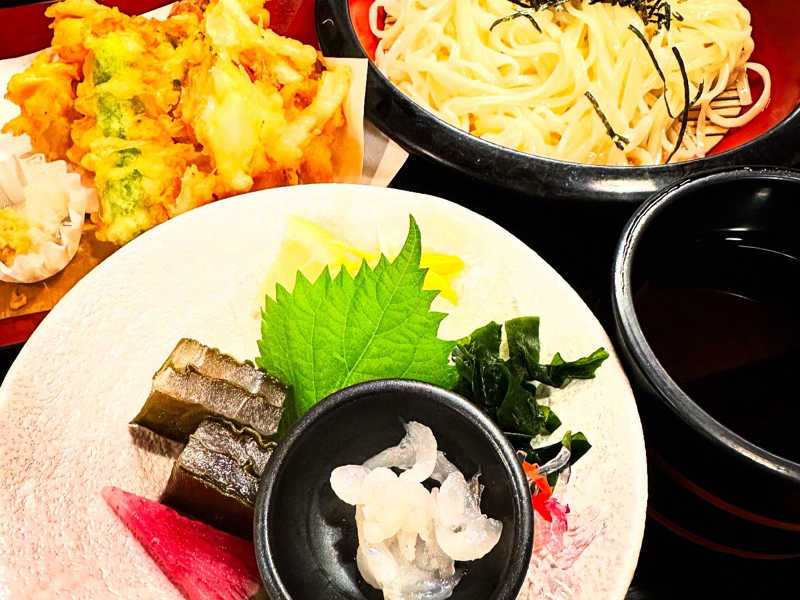 夕飯で富山の味を一気に回収。白エビのお造りとかき揚げ、氷見うどん、サス昆布締めのセット。