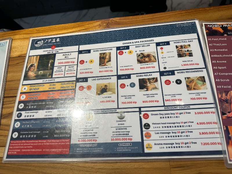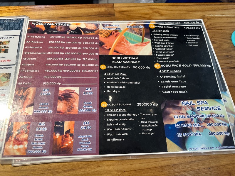 11時ころ着いたら、サウナは12時からと言われて1時間ヘッドスパをやってもらいました。これが想像以上に気持ちよくて、頭と肩がスッキリ。ちなみに入場料30万キープ(約2,000円)にヘッドスパ9万キープ(約650円)で、スパの安さが際立ちます。