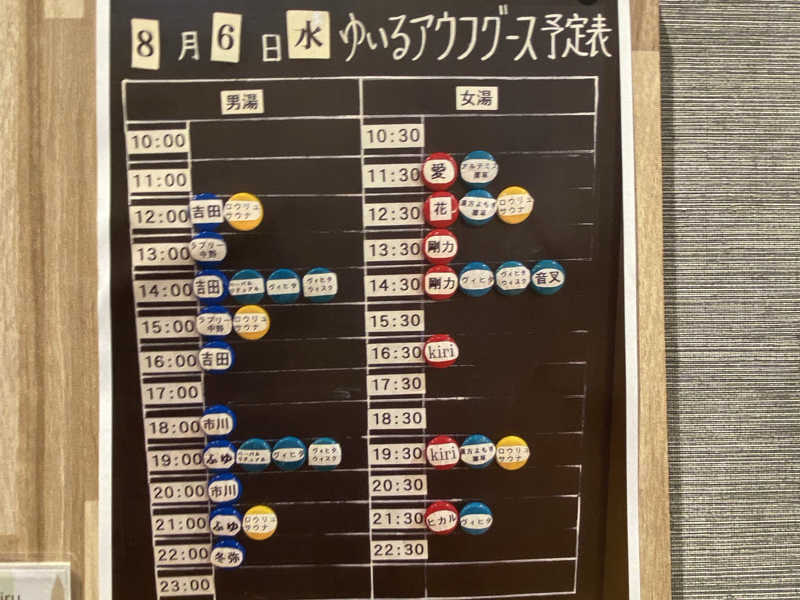 スタイル:タオル スケジュールは浴室入口前のホワイトボードで判る。 また、Twitterやインスタグラムでもスケジュールが発表される。 男性毎時00分、女性毎時30分にアウフグースの場合が多いが、平日などはない時間帯もあるので注意。 |