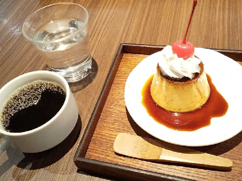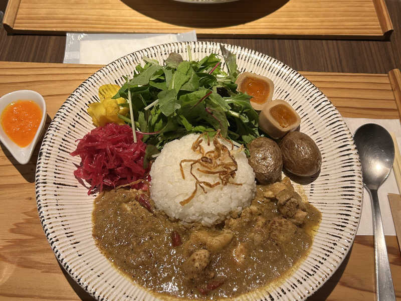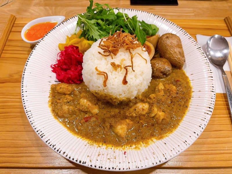 スパイスカレーは、ちゃんとお店の味!付け合わせもおいしい! プリンが硬めで卵の味がして好きなタイプ🍮