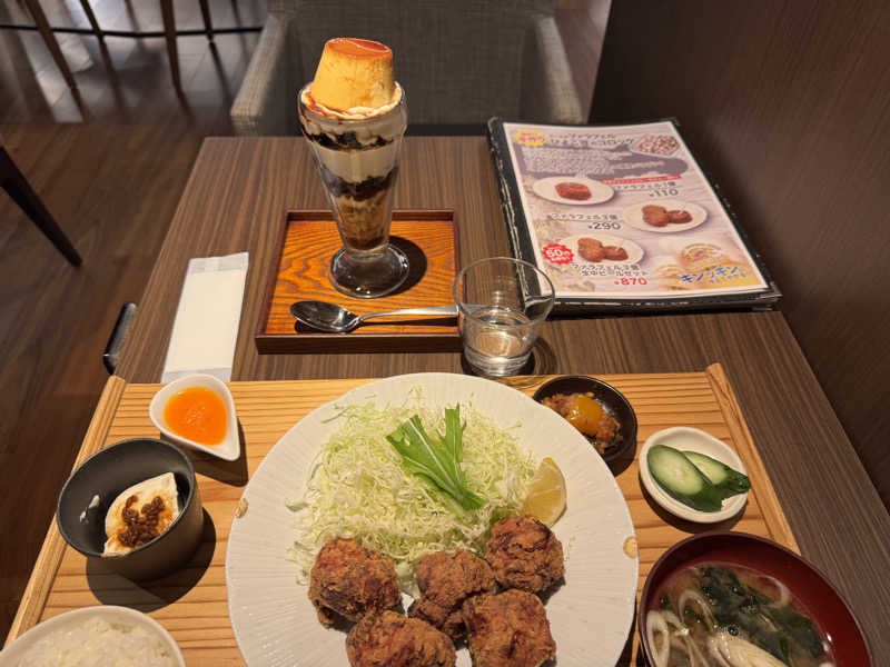 唐揚げも、たくさん入っていて美味しかった。プリンパフェもとても美味しかったです。