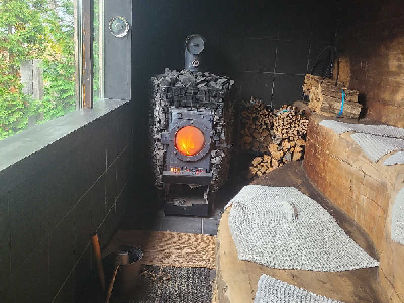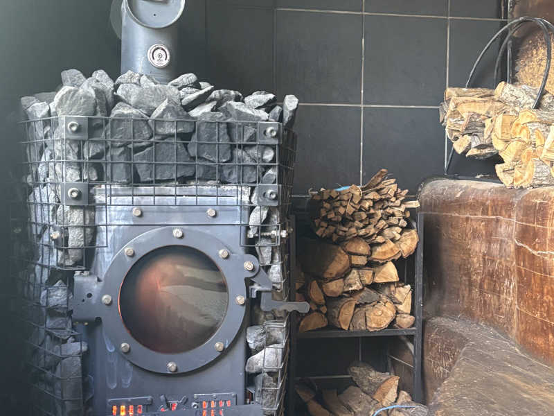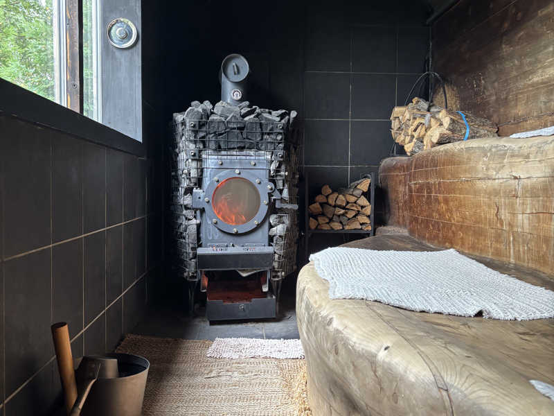 サウナは薪ストーブ、ヒロテテさんがロウリュするとゆっくり熱気が降りてくる