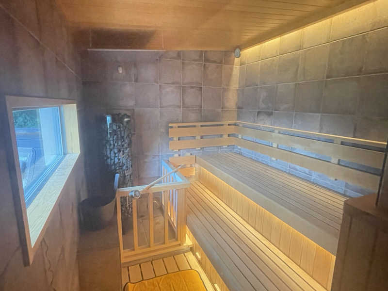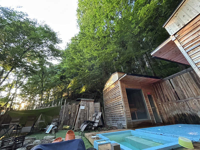 アメニティ置き場よりサウナバックをピックアップします。森のサウナに入るとインフィニティチェアと焚き火台がある外気浴スペース、その奥に水風呂と滝、左右にサウナ室と内気浴室があります。サウナマットを持って入ります。大きなストーブと並行に3段の座面があり10名程が座れる大きさです。正面に大きなガラス窓があり外光を取り入れるスタイルです。温度は96度とじんわり熱いです。セルフロウリュができより熱くすることも可能です。反対側の部屋はサウナ室と同じ造りで内気浴スペースとして使うことができます。しっかり汗をかき水風呂へ。温度は体感16度とシンシンと冷たく、天然水のため柔らかく気持ちいいです。深さが120㎝あるので首まで浸かれます。浅い水風呂のほうでは滝のように水が降り注ぐので滝行もできます。ととのいスペースは内気室もいいですが、やはり森に囲まれた外気浴が最高です。インフィニティチェアで仰向けになると木々が大きかぶさって青空を眺められる最高な環境です。新鮮な山の天然水をいただきながらととのえます。20時からは焚き火サービスがあり、揺れる炎、パチパチ音が森に響き渡ります。