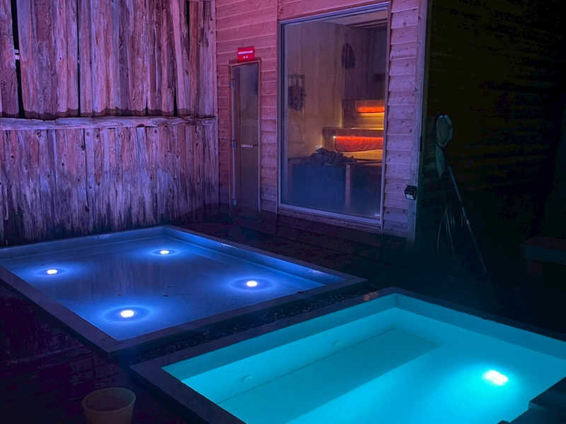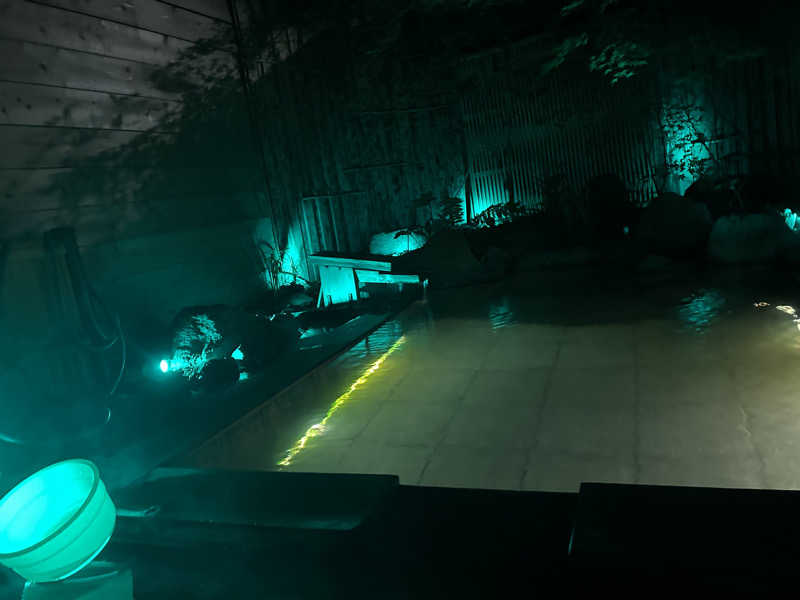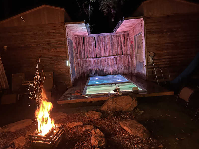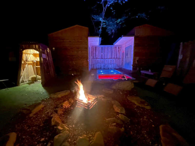 21:00から土日限定でフロントで夜泣き屋台での湯豆腐サービスをいただいて21:30から熱波師パッチさんによる熱波を受けに森のサウナへ。20:00から焚火が焚かれていて雰囲気最高!水風呂もライトアップされていてすごくエモい!