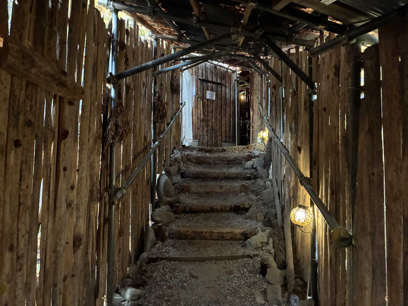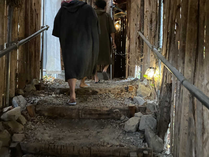 脱衣所でポンチョに着替え、外廊下を抜け、トンネルのような細道を抜けると、左右に並んだサウナ小屋と小屋に挟まれた水風呂が現れました。