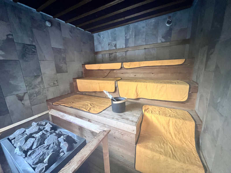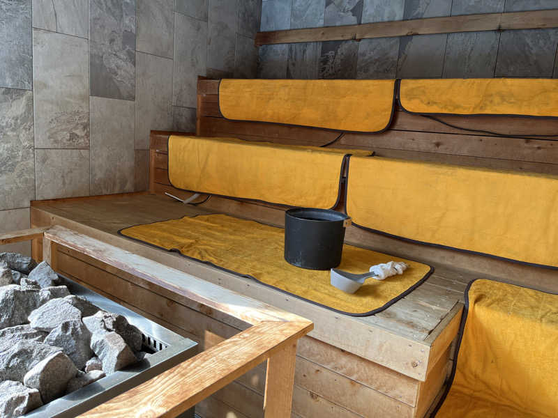 高温サウナは3段座面で温度は105℃表示。熱源はHARVIA製のサウナストーブです。全体的にはドライ目の体感ですが、セルフロウリュウが可能なので、セルフロウリュウするとかなり湿度と熱が広がって熱さを体感できます。