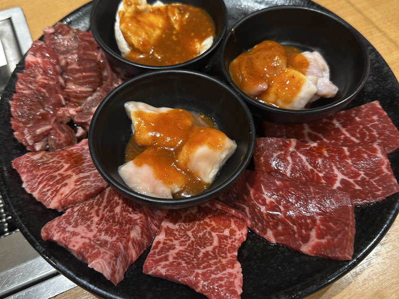 サラダ・ナムル・キムチ・ホルモン3種、カルビ・ロース・ハラミ・ユッケジャンスープ・ご飯。最高。