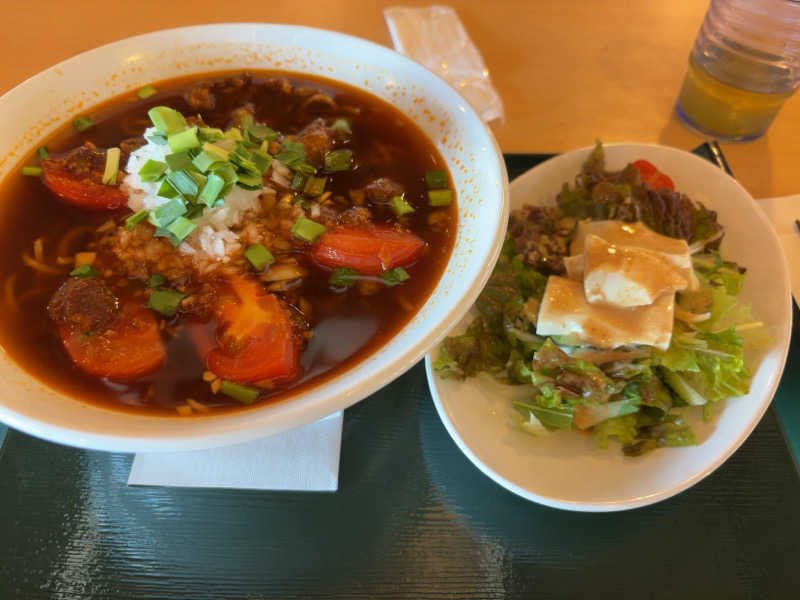 麻婆トマト麺は麻婆トマトがマッチしていて美味しい! 豆腐のサラダハーフサイズだけど、豆腐少なくなった