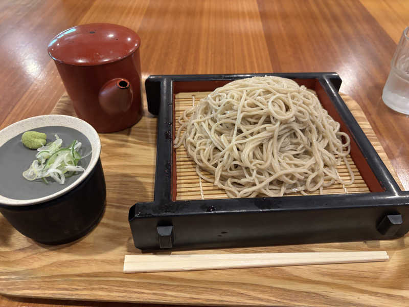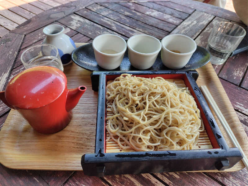 館内手打ちのそばに3種類のタレで味わう満足セット🤤クルミにとろろにネギわさび。クルミが初体験の味😙