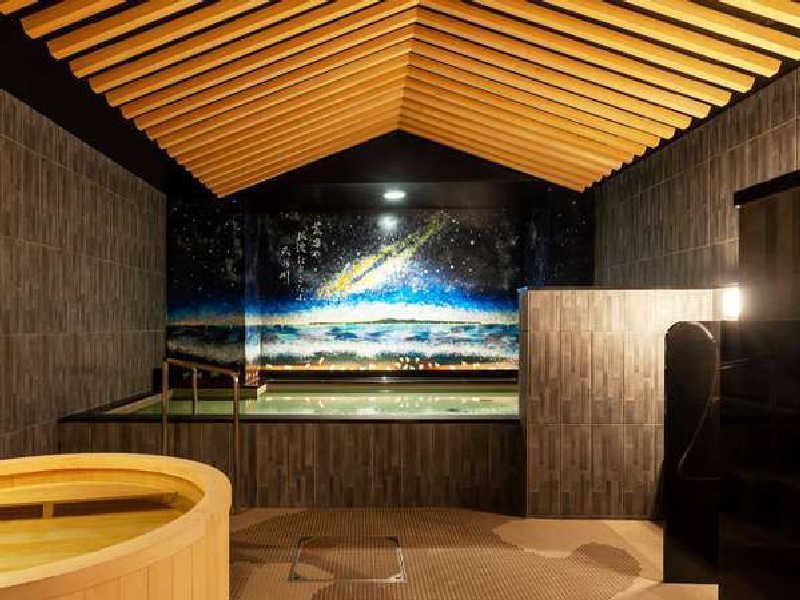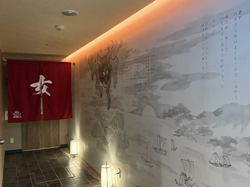 浴室に入ると正面の壁に巨大な絵が描かれており、照明は暗めの落ち着いた雰囲気。