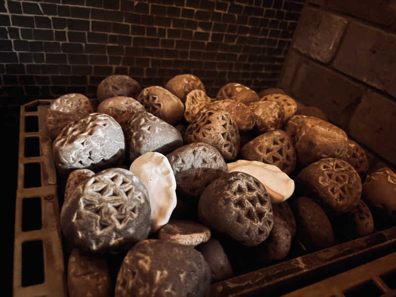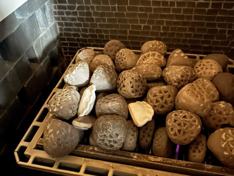 サ室は3人入れるくらいで高い位置にあるから結構あつい!座る前にセルフロウリュウ2杯したらあつくて悶えた🤣1杯で良かった🤣香ばしいお茶のような香りが良くて、餃子型のサウナストーン可愛い🥟🩷