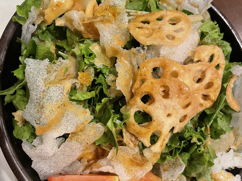 塩分補給!小腹も満たせる。レンコンチップ、えびせん、ポテチが乗ってて温玉が隠れてます🥚昔から大好き!