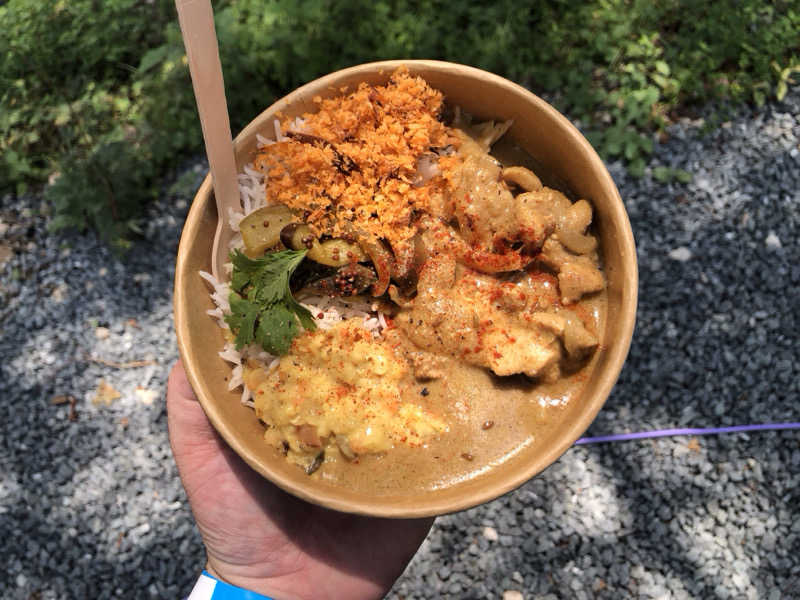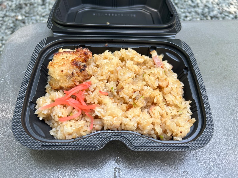 青空の下で頬張る唐揚げチャーハン🍚香ばしさと爽快感が口いっぱいに広がる至福の味👍🏻⸒⸒