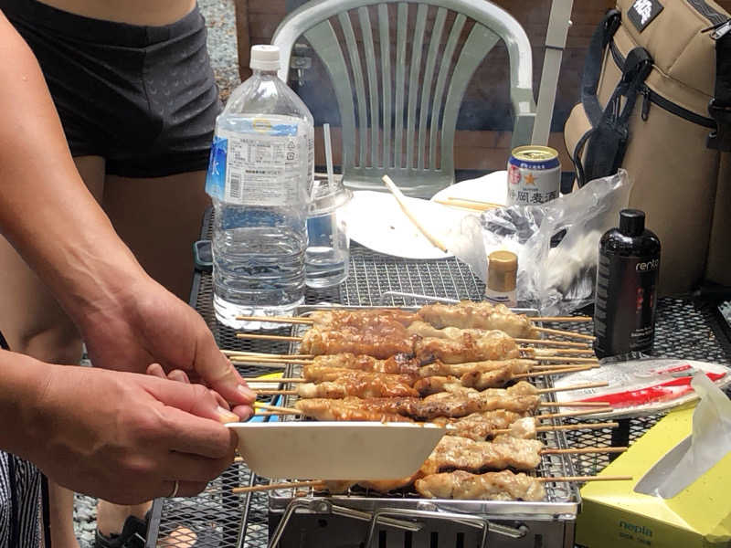 あつあつ君ファミリーが用意してくれた焼き鳥🐓タレとすりおろしニンニクをつければ🍺が欲しくなる🤤