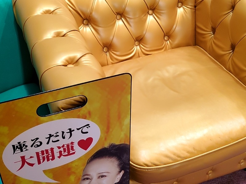 名物女将がいると知らずに行ったら入ってすぐに「座るだけで開運」のゴールデンソファが。