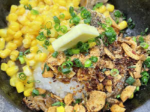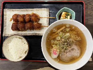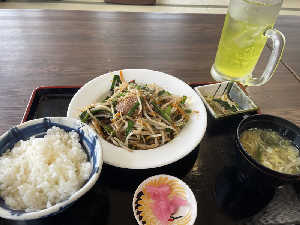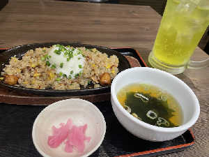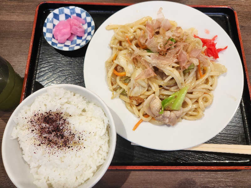 とろみのある熱々の焼うどんとゆかりごはんの組み合わせ。シャキシャキ野菜がたくさん入って750円。