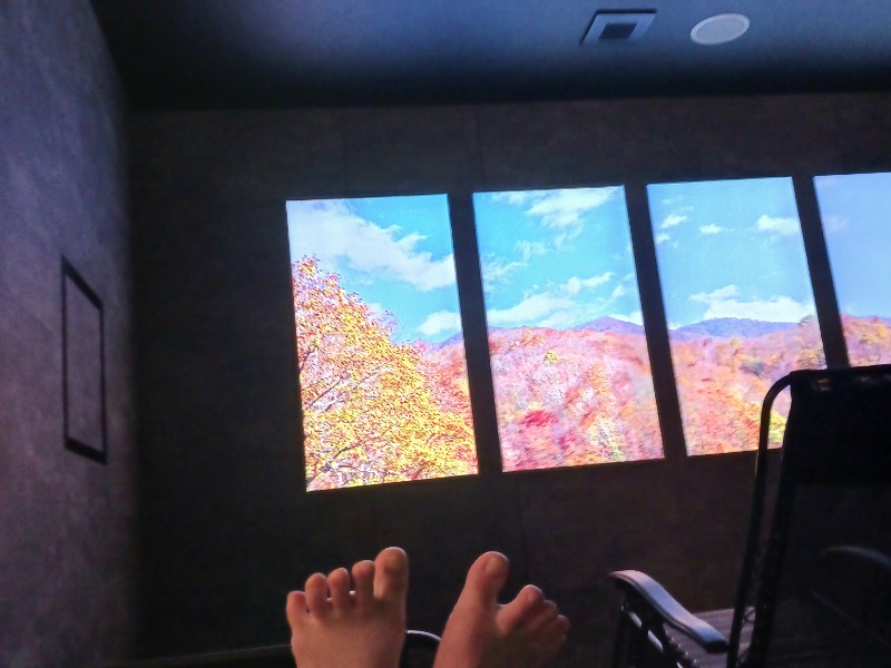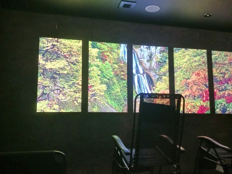 外気浴はインフィニティ中心に暗くて静かな空間に景色のビジュアルがいくつか映し出される感じ。