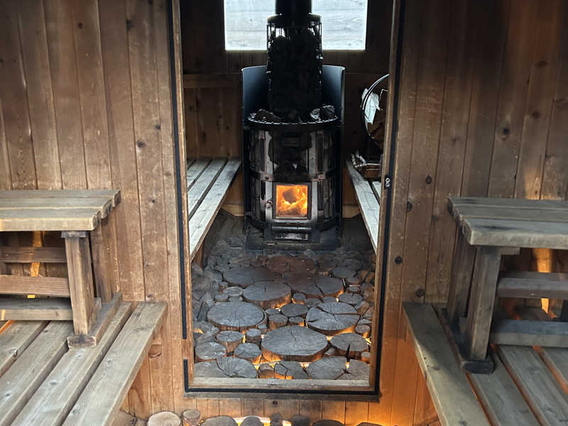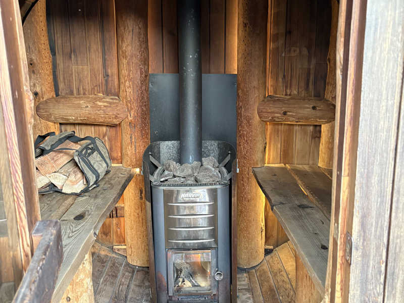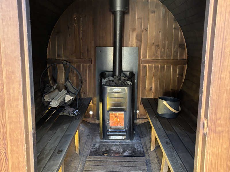 サウナはバレル型。中には大きなストーブが入っていて、薪の入れ方次第で温度を自分好みに変えられます。ロウリュもガンガンできるので、思い通りのサ室を作れるのが楽しい。