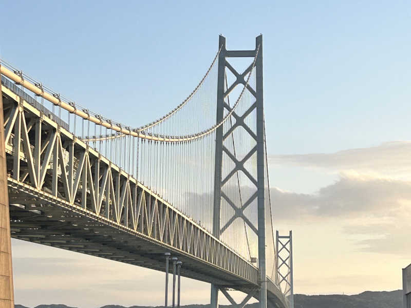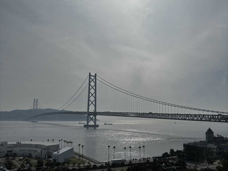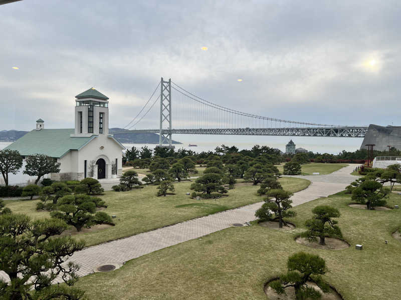 明石海峡大橋ビューの中庭も目で楽しみ、サウナのフロントへ。飲食もここでできるように考えられている。