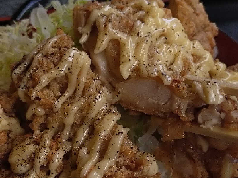 塩尻名物の山賊焼の丼。ブラックペッパーとマヨネーズが最高。途中味変で黒酢を掛け美味しく頂きました。