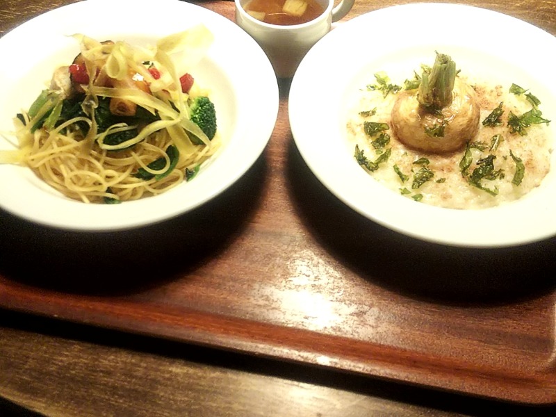 スープパスタは豆乳スープで最後の一滴まで頂きリゾットのカブ柔らか美味しく頂きました。