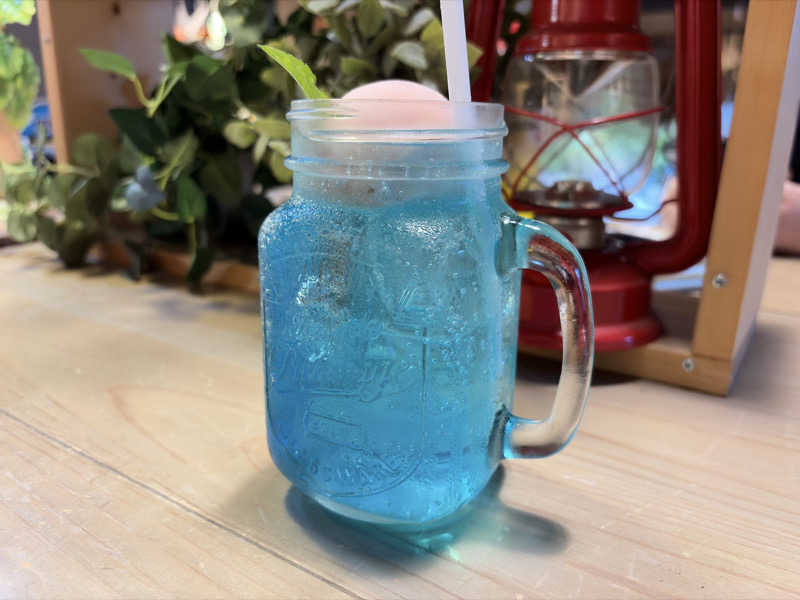 ブルーハワイみたいなソーダ。サウナ上がりに寛ぎながらリゾート気分。