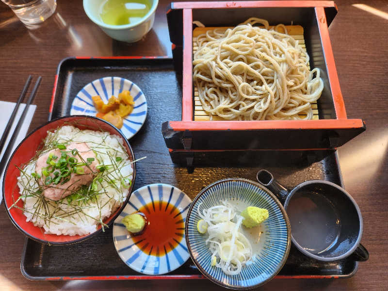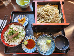 風味の良いそばとわさびを利かせたねぎとろ丼にそば湯までついて1,250円。