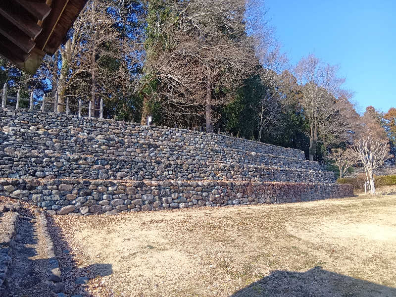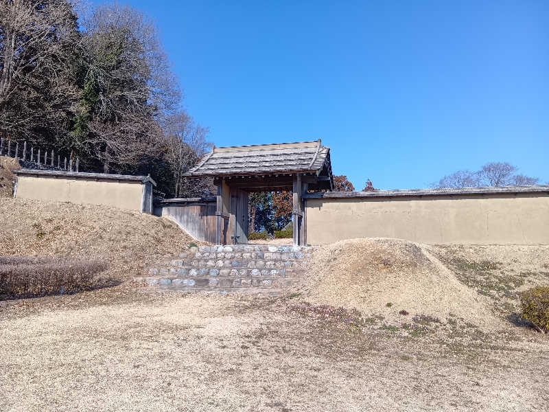 本曲輪、伝御殿曲輪、二の曲輪の土塁や堀や畝、三の曲輪の復元四脚門と復元石積土塁などを満喫😆
